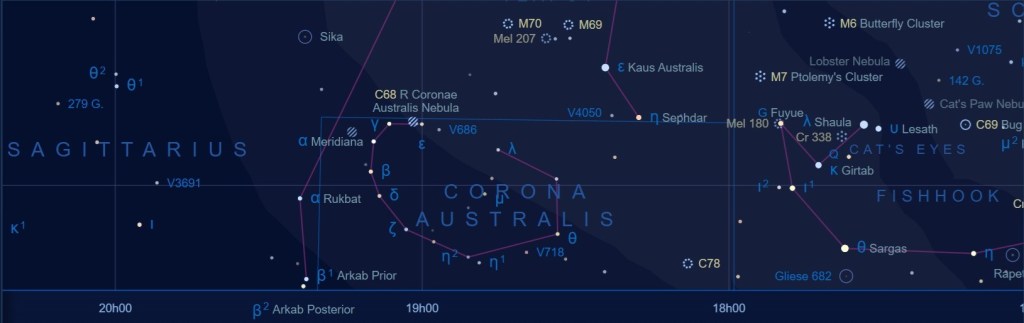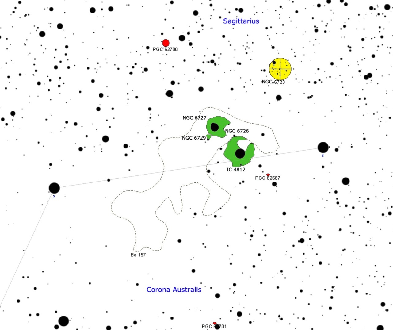 The star illuminating NGC 6729 is a T Tauri star – a type of young star whose brightness fluctuates over time. The fan-shaped nebula opens-up between the variable stars R Corona Australis (R CrA) and T CrA to the south-east (see skymap below ref. Robert Mura). R CrA is a pre-main-sequence star within the Corona Australis molecular complex, which is one of the closest star-forming regions to the Milky Way galaxy. Intriguingly, this wonderful, hazy looking nebula exhibits both variable brightness and morphology over time.