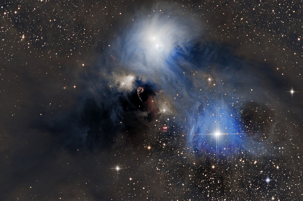 FLAMING STAR NEBULA, IC405 (1) This nebula is illuminated by a powerfully bright blue variable star, AE Aurigae. The object’s epithet comes from the brightly lit ripples of gas and dust at the top of the image, illuminated by AE Aurigae and glowing hydrogen gas. This “runaway star” was ejected by a collision two million years ago from the Triangulum region of The Great Orion Nebula.