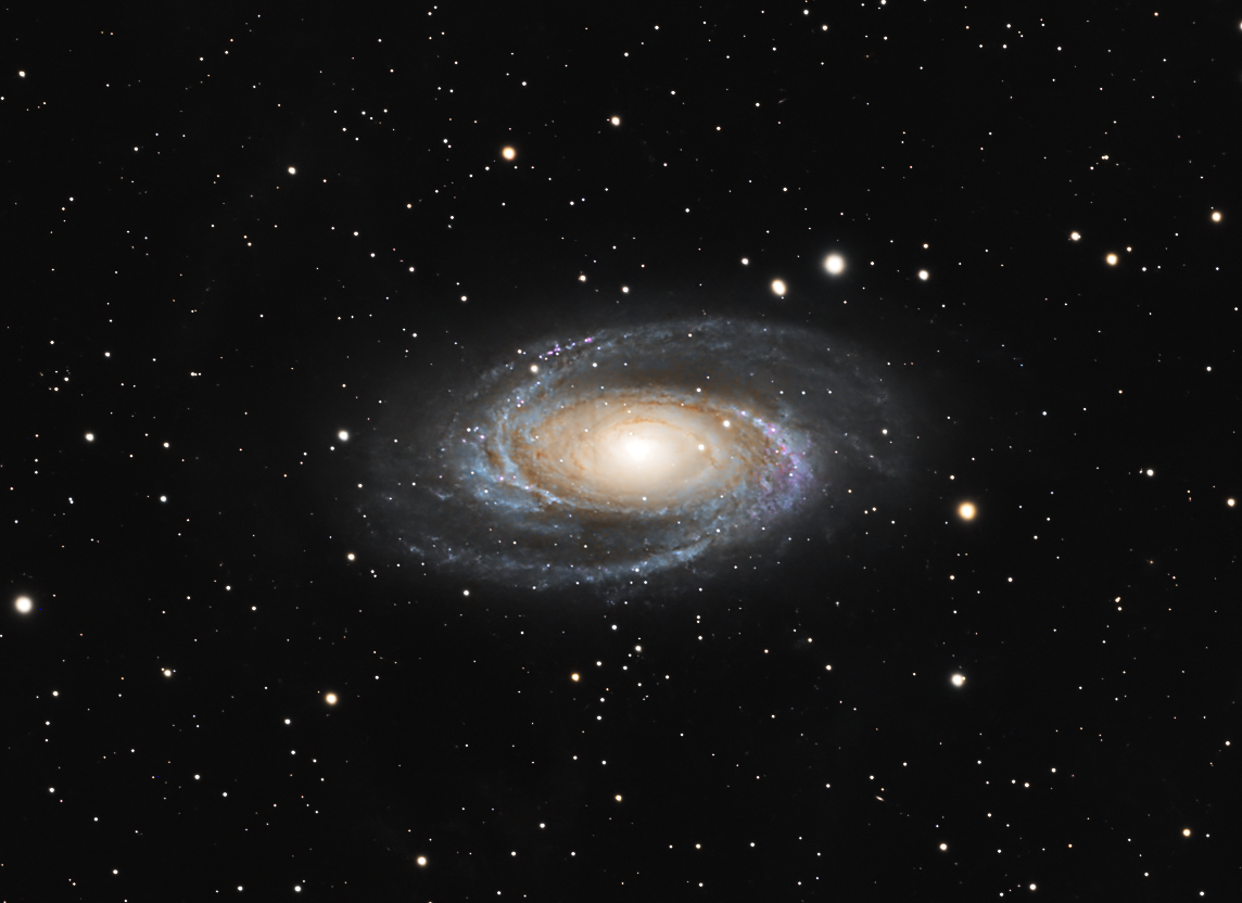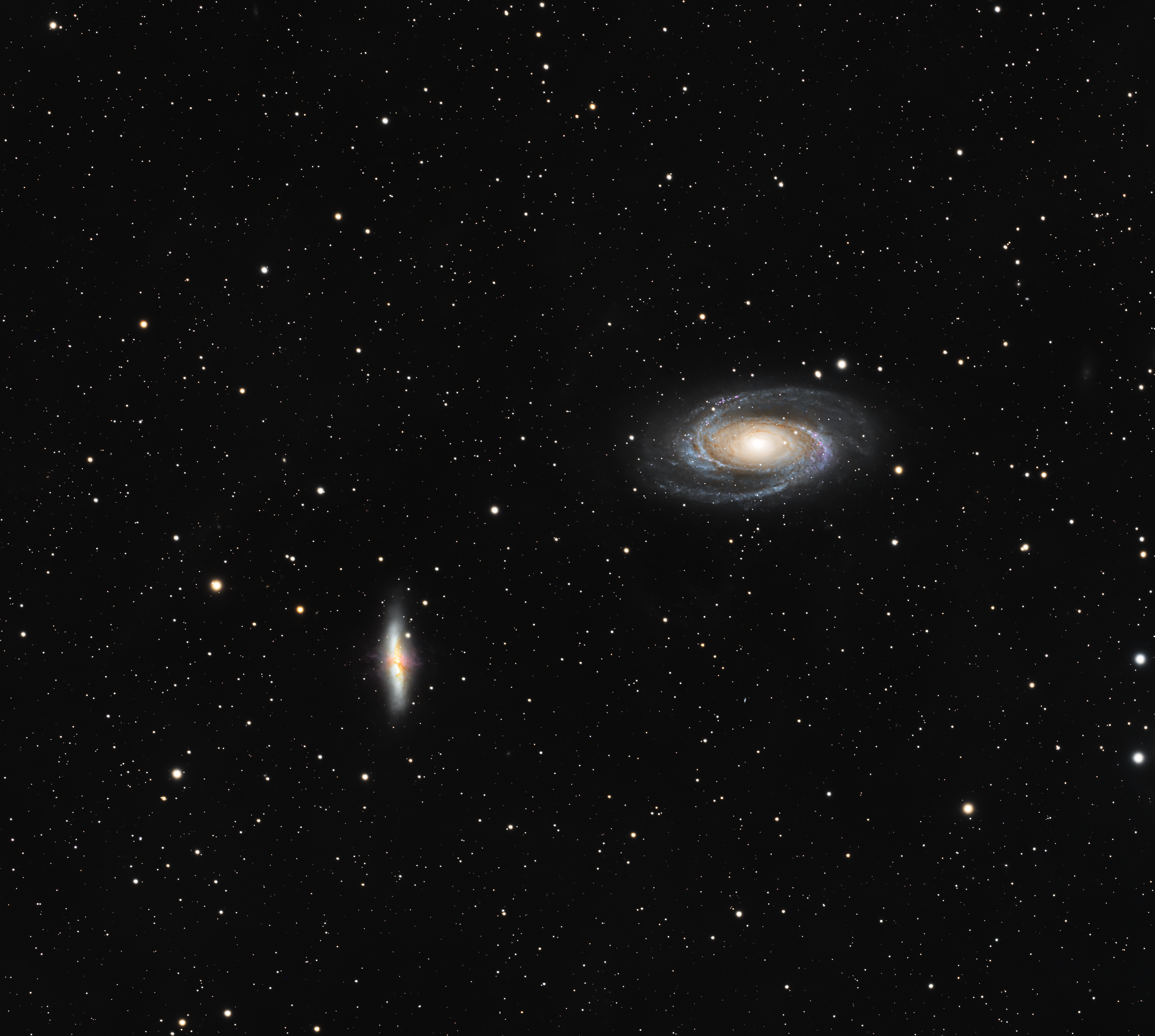 M81 and M82 are two well-known galaxies in the northern sky, which being just 20o from Polaris are also circumpolar. Located in the constellation Ursa Major, they appear near each other in the sky and interact gravitationally. Both galaxies were discovered in 1774 by the German astronomer Johann Elert Bode and later included in the Messier Catalogue. Together, M81 and M82 form the central members of the M81 Group, a small cluster of galaxies located not far from our own Local Group.