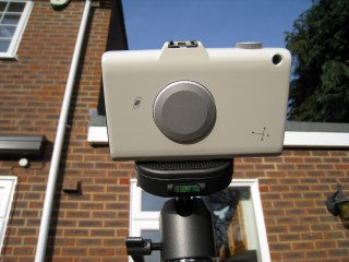 The high position of the Vixen Polarie on the tripod provides an otherwise elusive view of Polaris between the garage / utility room and the main house for polar alignment, at last! Alignment of the mount is carried out by viewing through the hole in the top right of the Polarie – better alignment can be achieved by using a polar scope which fits through the middle of the Polarie mount.