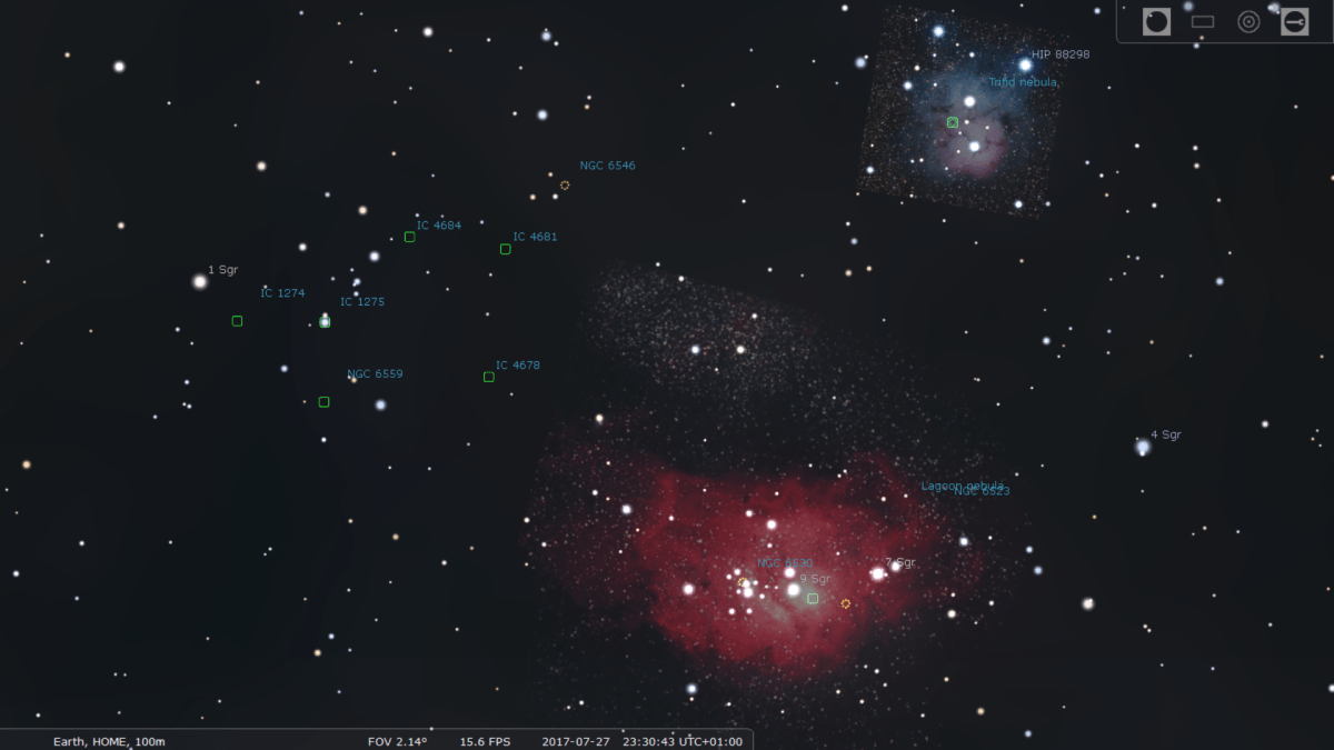M20 and M8 Published August 2, 2017 at 1920 × 1080 in Cosmic Nursery ← Previous Next → Relative postions of M20 & M8 (Stellarium)