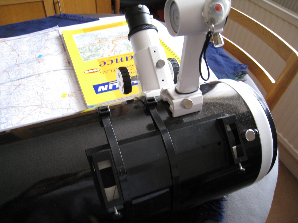 The Telrad locates and screws quickly onto a base (available at different heights) fixed by cable ties alongside the finderscope.