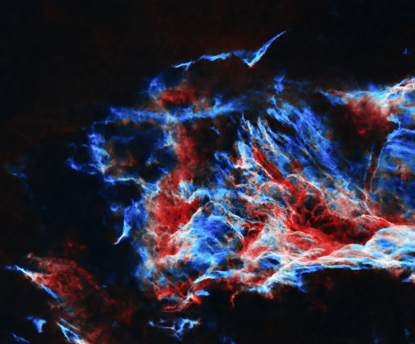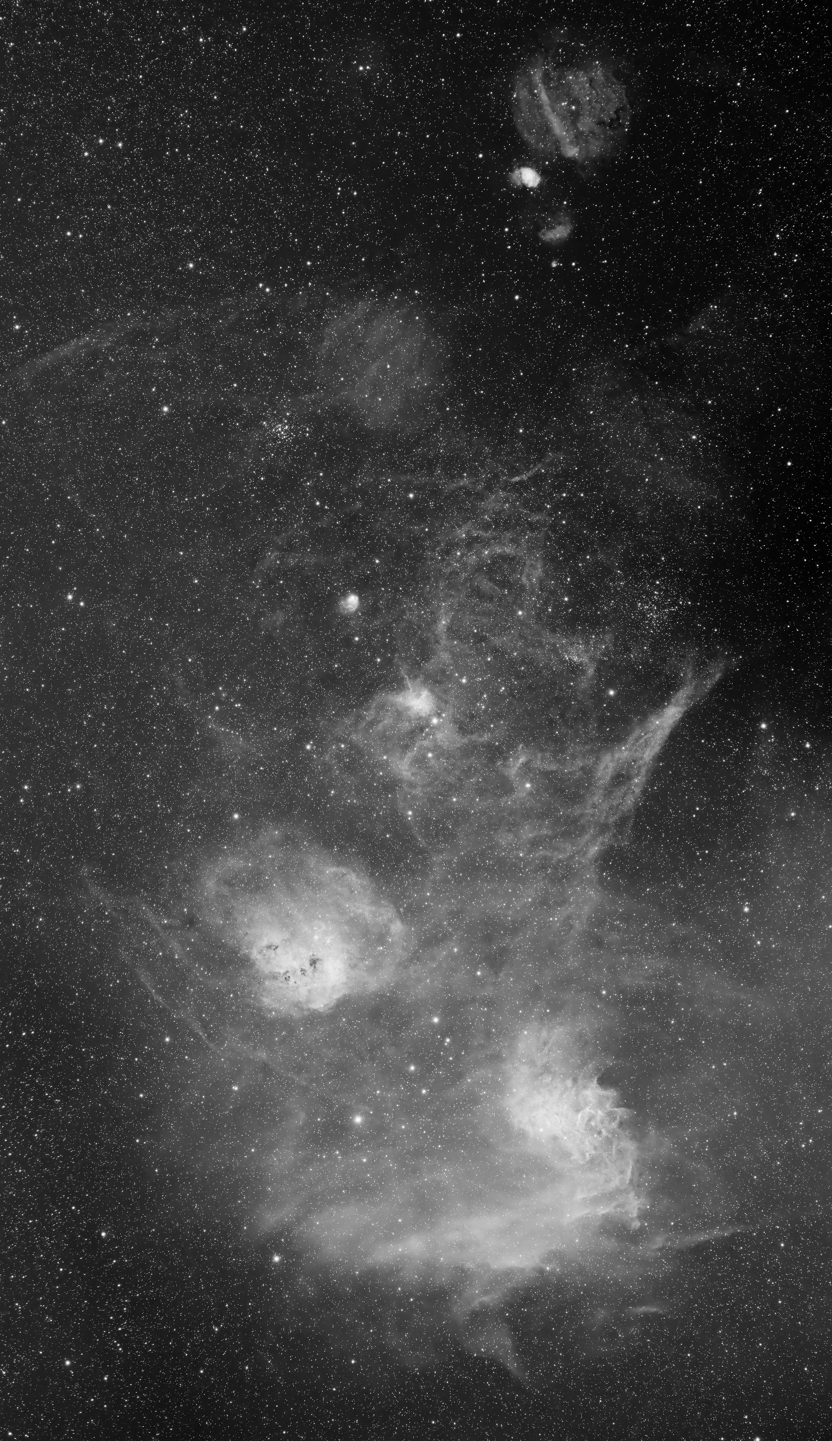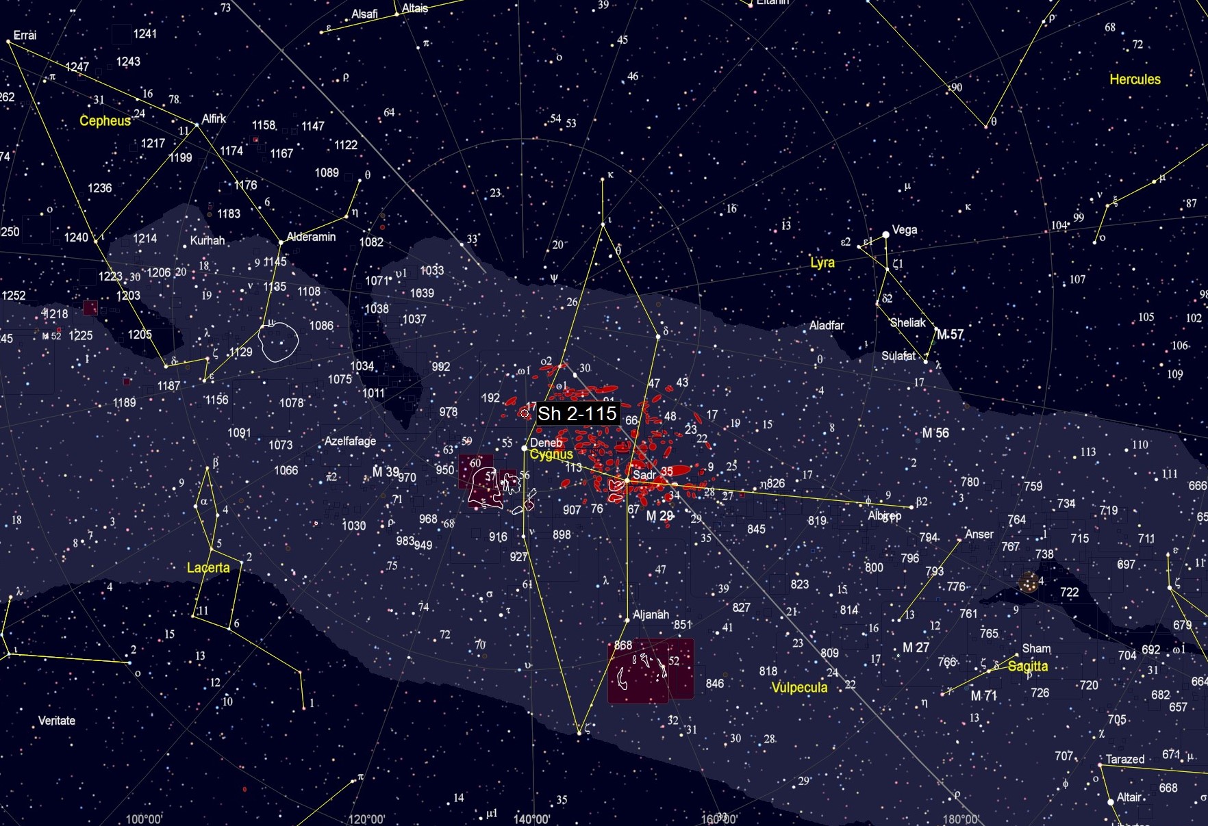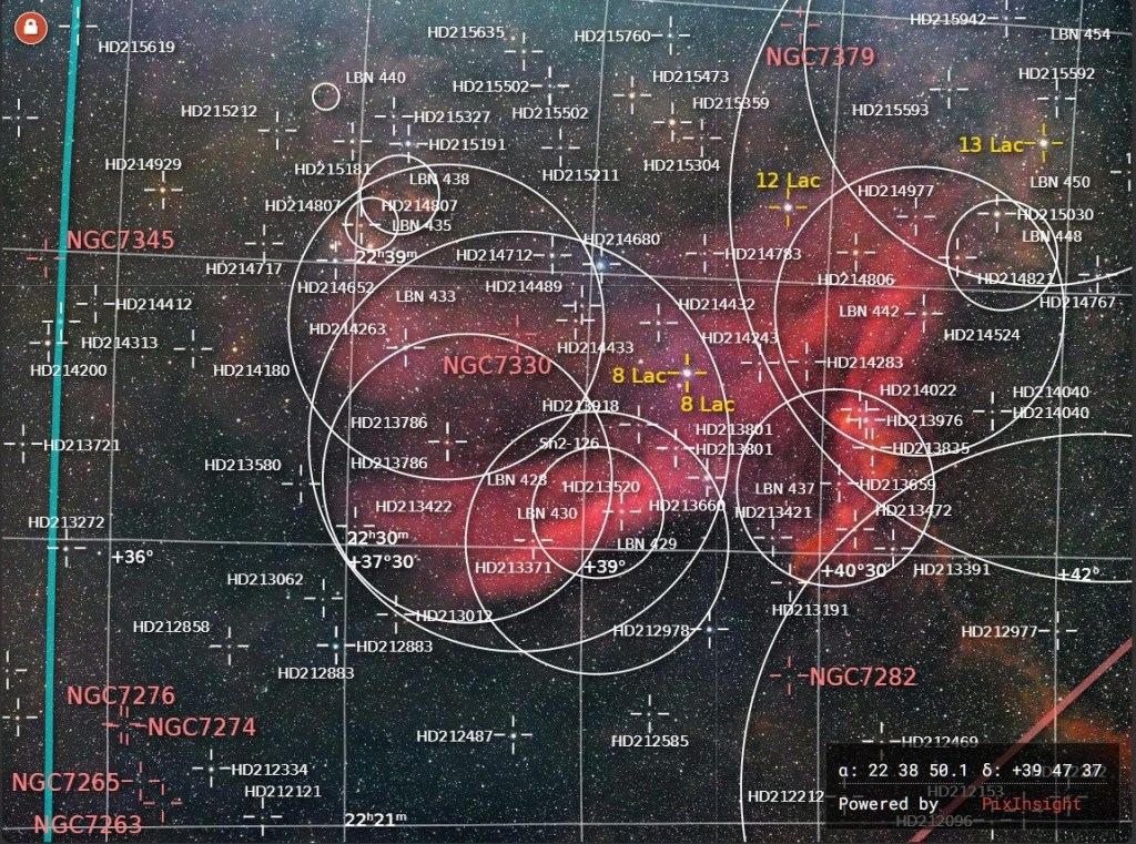 Located along the western edge of Milky Way in the southern section of Lacerta, is the large but faint emission nebula SH2-126 AKA the Great Lacerta Nebula (GLN). Consisting of a reddish filament structure with a size of over 3 degrees, the nebula forms a “stellar funnel” at the centre and snaking away to the right is LBN 437 or the Gecko Nebula, a molecular cloud whose denser part is associated with bright young stars; the fascinating structure of the nebula is best seen in the starless Ha image below. The source of ionization is intense ultraviolet radiation from the stars including 10 Lacertae, a blue main sequence star.
