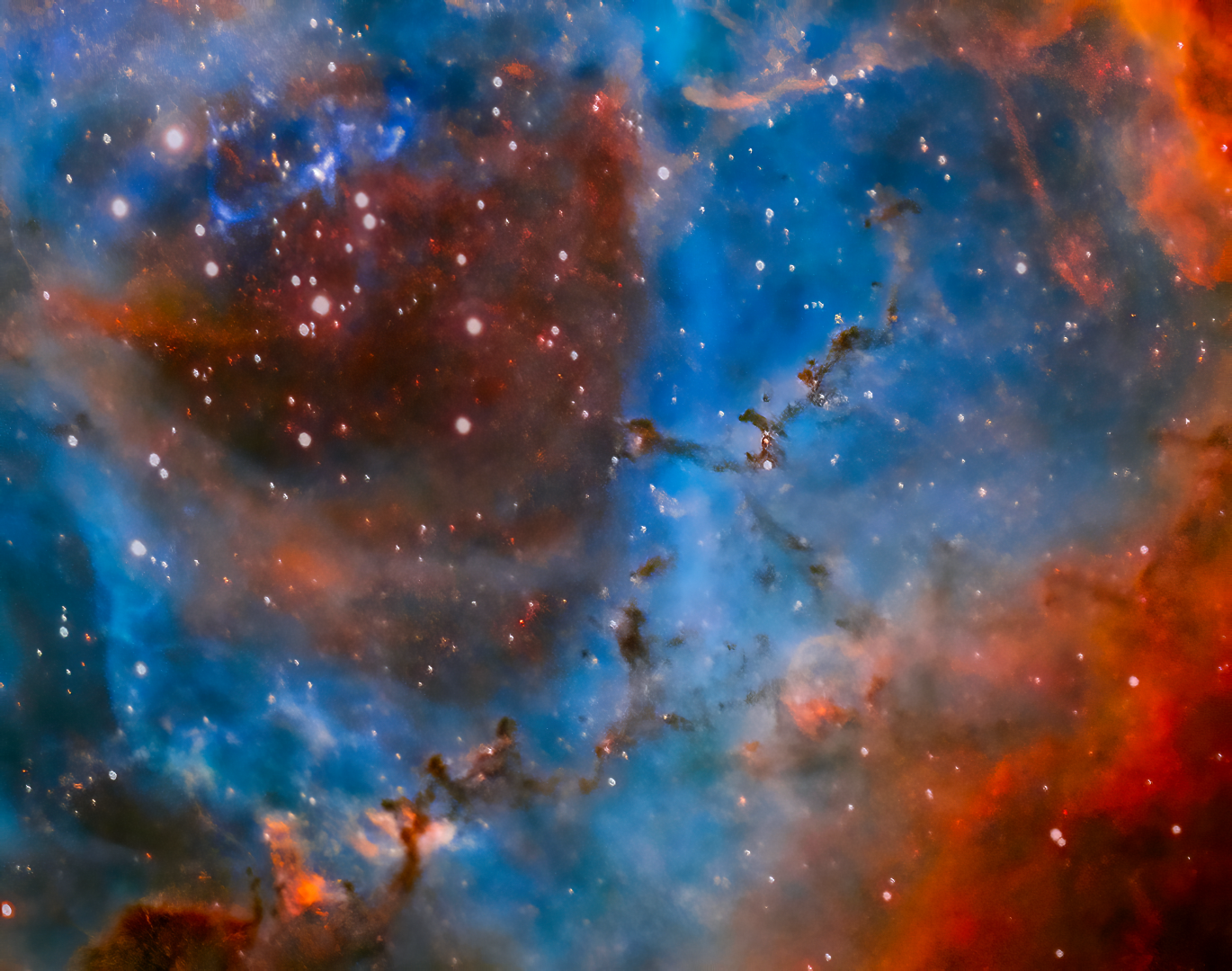 The Orion Nebula is a gigantic cosmic cloud of interstellar dust and gas, which is the basis for the birth of numerous new stars or a “star nursery” (see starless image below) . Moreover, these powerful, young stars unleash vast streams of ultraviolet radiation that sculpt the nebula into a myriad of fantastic shapes, further highlighted by a red tint that arises due to the presence of hydrogen gas. For astronomers, such activities reveal much about the processes of how stars and planetary systems are formed from collapsing clouds of gas and dust.