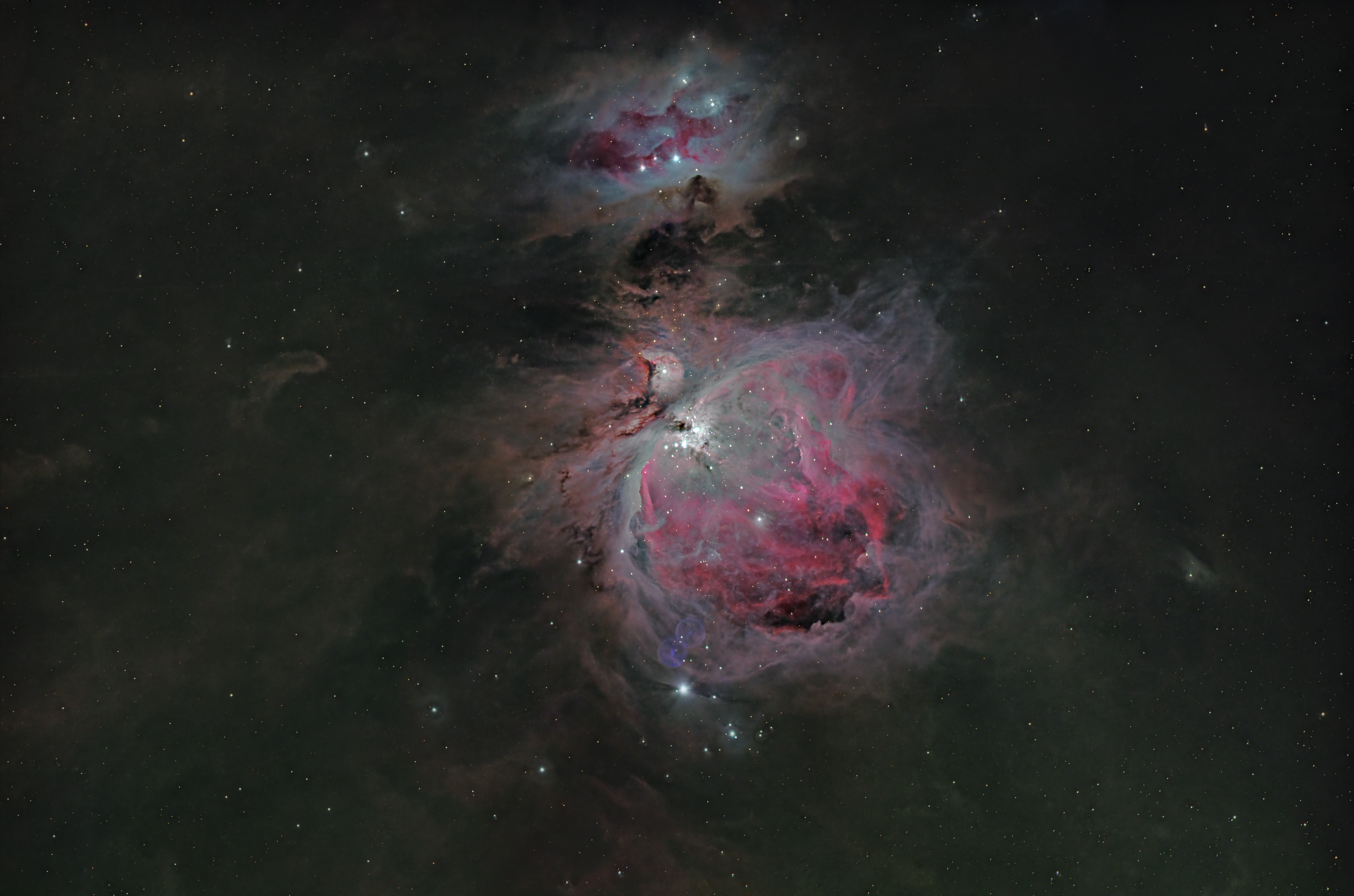 In addition to using the conventional LRGB processing workflow, to uncover the exciting detail that lies within the Great Orion Nebula on this occasion it was necessary to apply some additional processes. First, after ensuring perfect star alignment of all images, the three 180, 60 & 15 second exposure stacks are combined using HR Composition. At first the bright areas of the combined image still look blown-out but, as if by magic, careful application of HDR Multiscale Transformation then reveals the underlying details such as the Triangulum. Thereafter it’s all downhill, except in this case I was further assisted by the use of three new scripts that I can highly recommend: