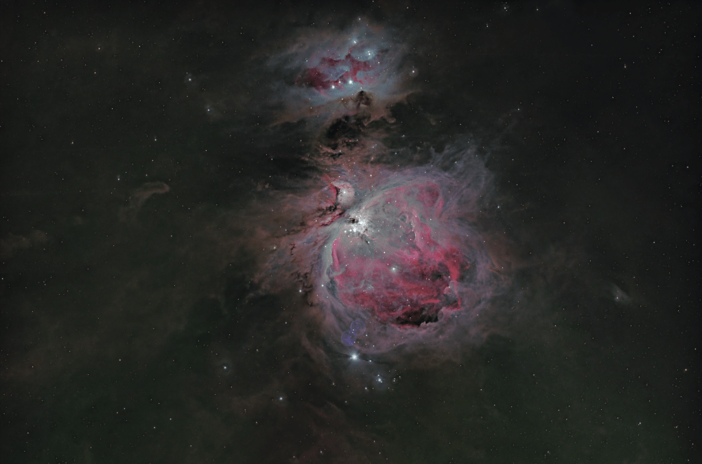Known as the Trapezium, four stars tightly located at the centre of M42 are very difficult to image, because of the overpowering bright white light that obscures this area from sight. However, for astrophotographers the elusive nature of the Triangulum is therefore considered to be the ultimate measure of a good Orion Nebula image. To overcome this problem, the key is to image the nebula across a range of exposures, from very short to long, which can then be compiled into a single final photograph that equally captures details of bright and darker areas alike.