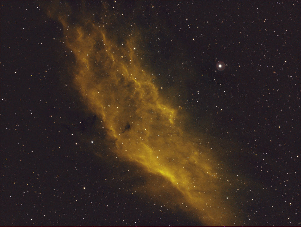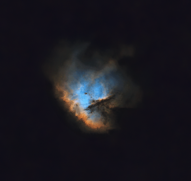 Using the same OTA but with a mono CMOS camera and a good set of filters, the new data set obtained was much improved, and with better processing experience it was time to see the monkey (or not) in a new light.  The first thing to do was present the image in an orientation that produces a more favourable perspective (less monkey like).  Using a basic SHO palette in PixInsight the initial image was promising (see below) but with an alternative PixelMath dynamic SHO palette* and then processing with autocolor script, color saturation, Russell Croman’s XT-suites and other tweaks, I was pleased to see that the monkey was nowhere to be seen in the final image (see image at the top-of-the-page), or at least to my eye.