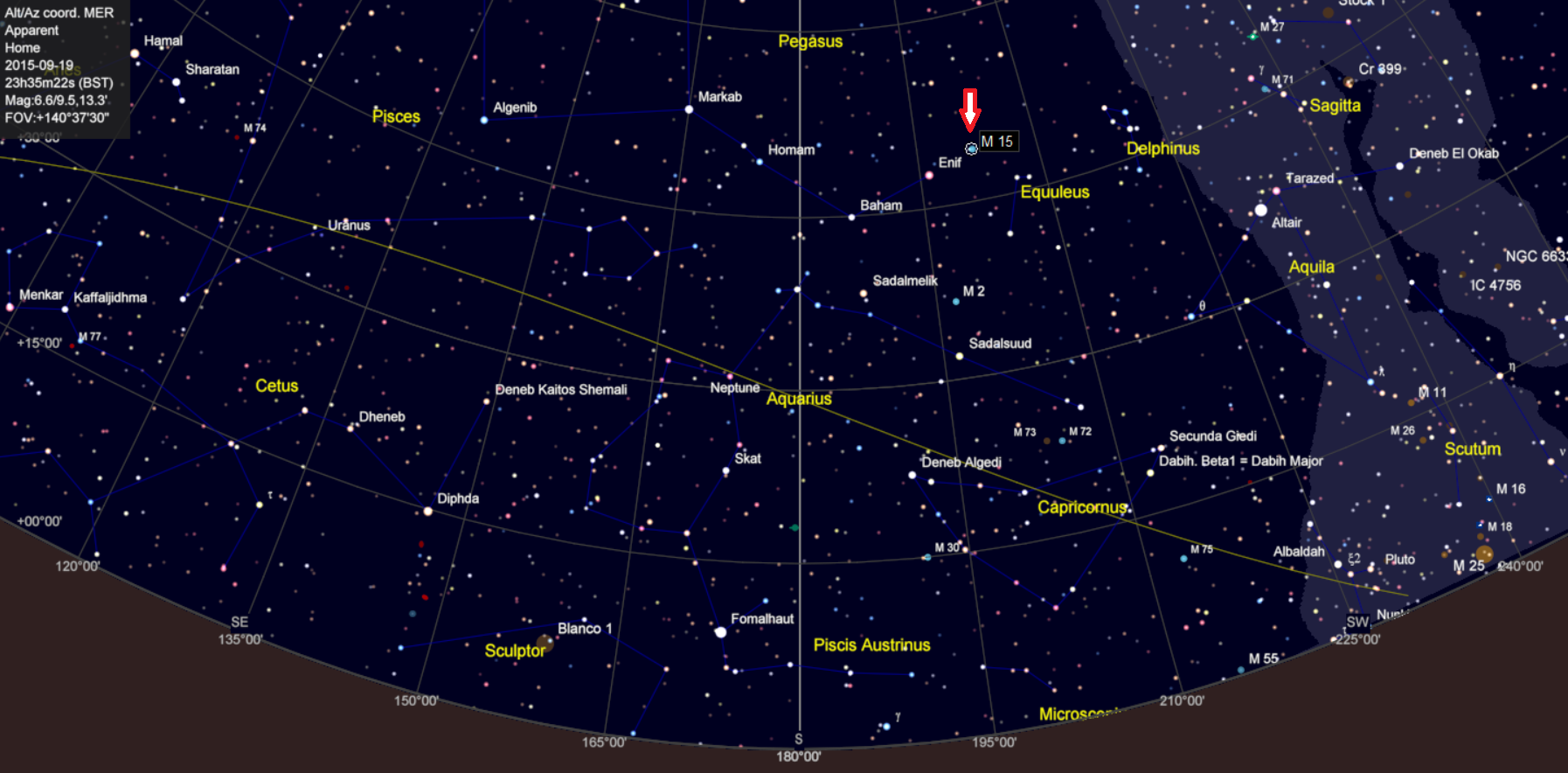 Globular star cluster M15 lies about 33,000 light years away towards the constellation Pegasus, about 4° northwest of Enif, the star at the tip of Pegasus’ nose. It was discovered by French-Italian astronomer Giacomo Filippo Maraldi in 1746 and rediscovered by Messier in 1764. At magnitude +6.2, M15 is generally considered to rank amongst the finest objects of its type in the northern sky.