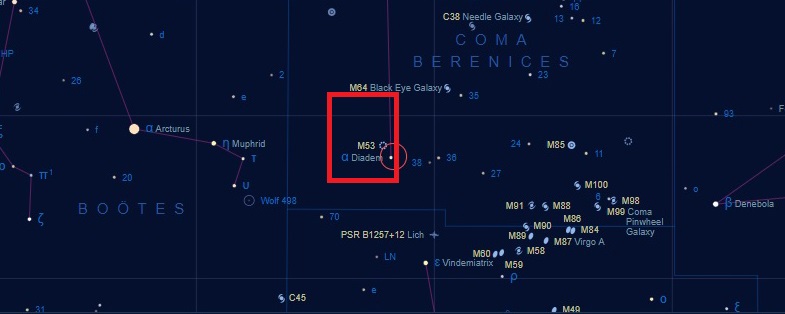 All-in-all I believe these two globular clusters, combined with the star studded background that just includes the binary Diadem star (Upper edge + right of middle – main image, top of the page) southwest of M53, altogether makes for a rich and interesting final image.