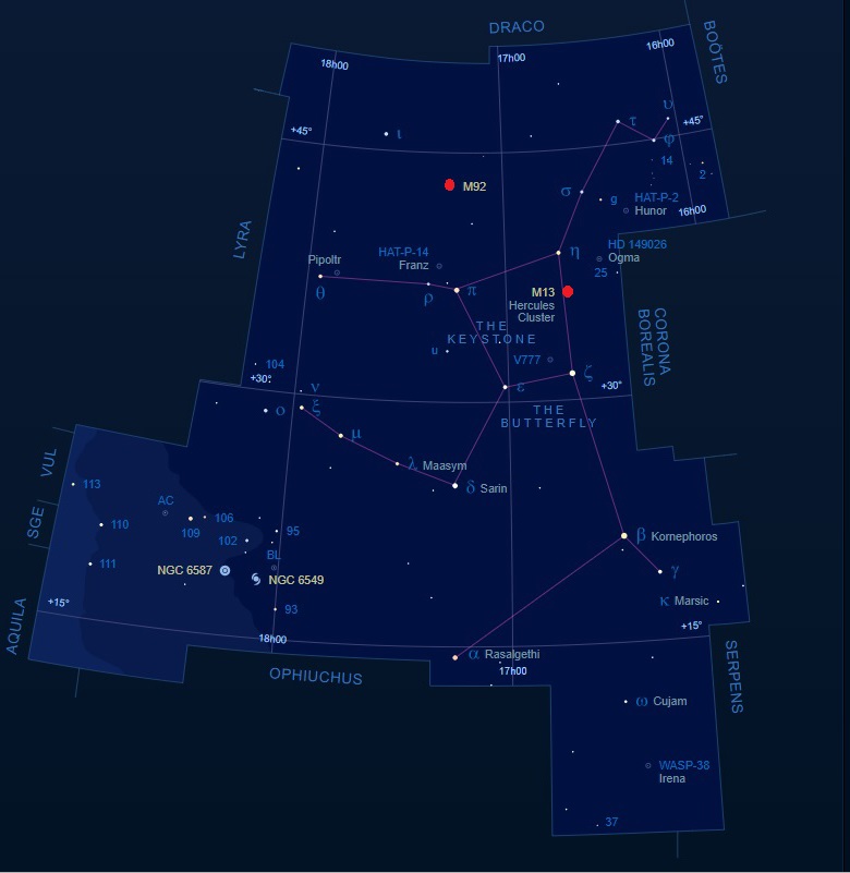 After imaging the globular cluster M53 from Fairvale Observatory in early April, it was opportune to be able to continue the same theme with my first two DSW images taken during Q1 and Q2 – the globular clusters M13 and M92, both located in the constellation of Hercules. With an angular separation of just 9o 33’, spatially the two clusters appear as neighbours but in reality M13 is some 4,560 thousand light-years closer. Spanning some 145 light years in diameter, M13 consists of several hundred thousand stars and as the brightest globular cluster in our galaxy it is generally considered to be the finest in the Northern Hemisphere. Whilst somewhat overshadowed by its more famous neighbour, M92 is still one of the brightest globular clusters orbiting the Milky Way and at +11 billion years is one of the oldest.