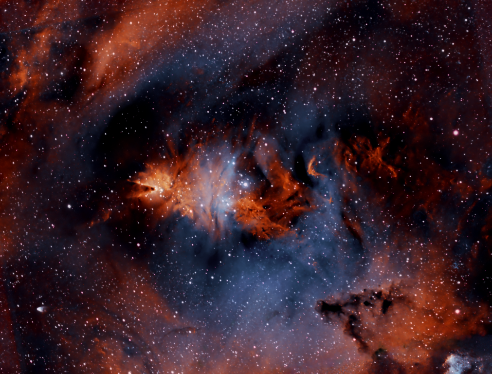 Despite having purchased a new ZWO1600MM-Cool mono camera at the end of 2016, by the time I was ready to use it at the end of the following March, the Rosette Nebula had almost disappeared over the western horizon for another year. Notwithstanding, in the limited time remaining I managed to capture a few Ha-OIII-SII subs, thus marking first light for the camera, which ironically resulted in one of my favourite images for 2017. Using narrowband for the first time it was immediately possible to see the potential of the new camera when imaging this type of object.