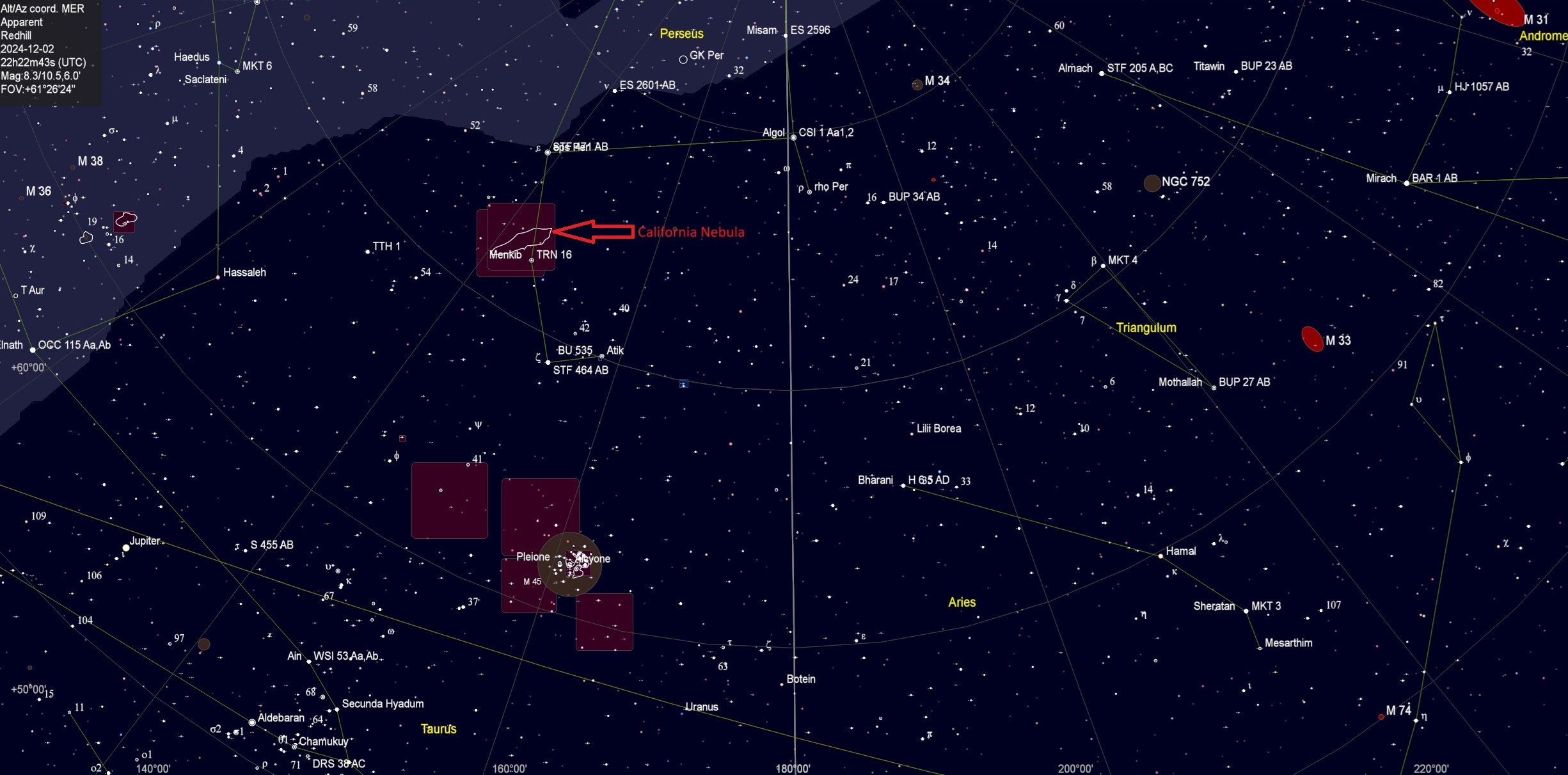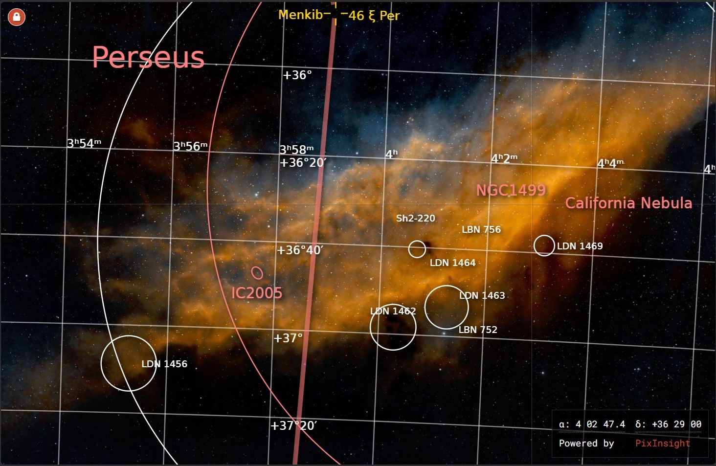 Curving across the Autumn night sky somewhat alone in the Perseus constellation, is the large (100 light-years ~ 2.50o) California Nebula. Being something of a prelude to the arrival of Orion and all its exciting objects, I have somewhat neglected this astronomical behemoth, only imaging it for short periods from time to time in the past. Despite continuing poor conditions and with some difficulty, on this occasion I manged nearly 8-hours integration, which with careful processing has brought out the true majesty of this exciting feature.