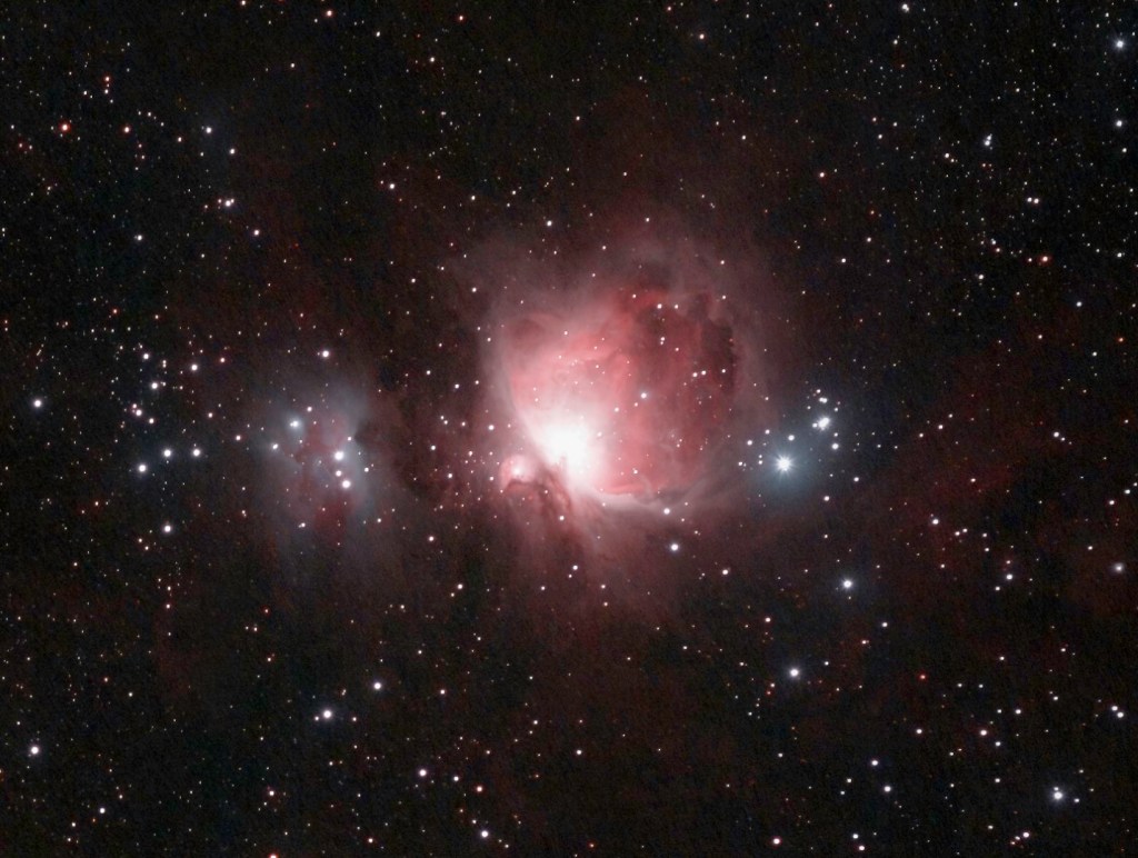 I get a warm feeling at the first view of the Orion constellation each year. Just viewed with the naked eye, late at night against a clear black sky it is a wonderful sight that somehow seems strangely reassuring but for the astronomer and especially astrophotographers, there are many exciting targets that hold great promise, principal of which is M42 the Great Orion Nebula. This winter my first view of Orion was last October, rising from the eastern horizon in the early morning, just as I was about to go to bed after a late-night imaging session. Unfortunately, it was more than two months before the weather relented and I was finally able to snatch an albeit brief image of the said Orion Nebula.