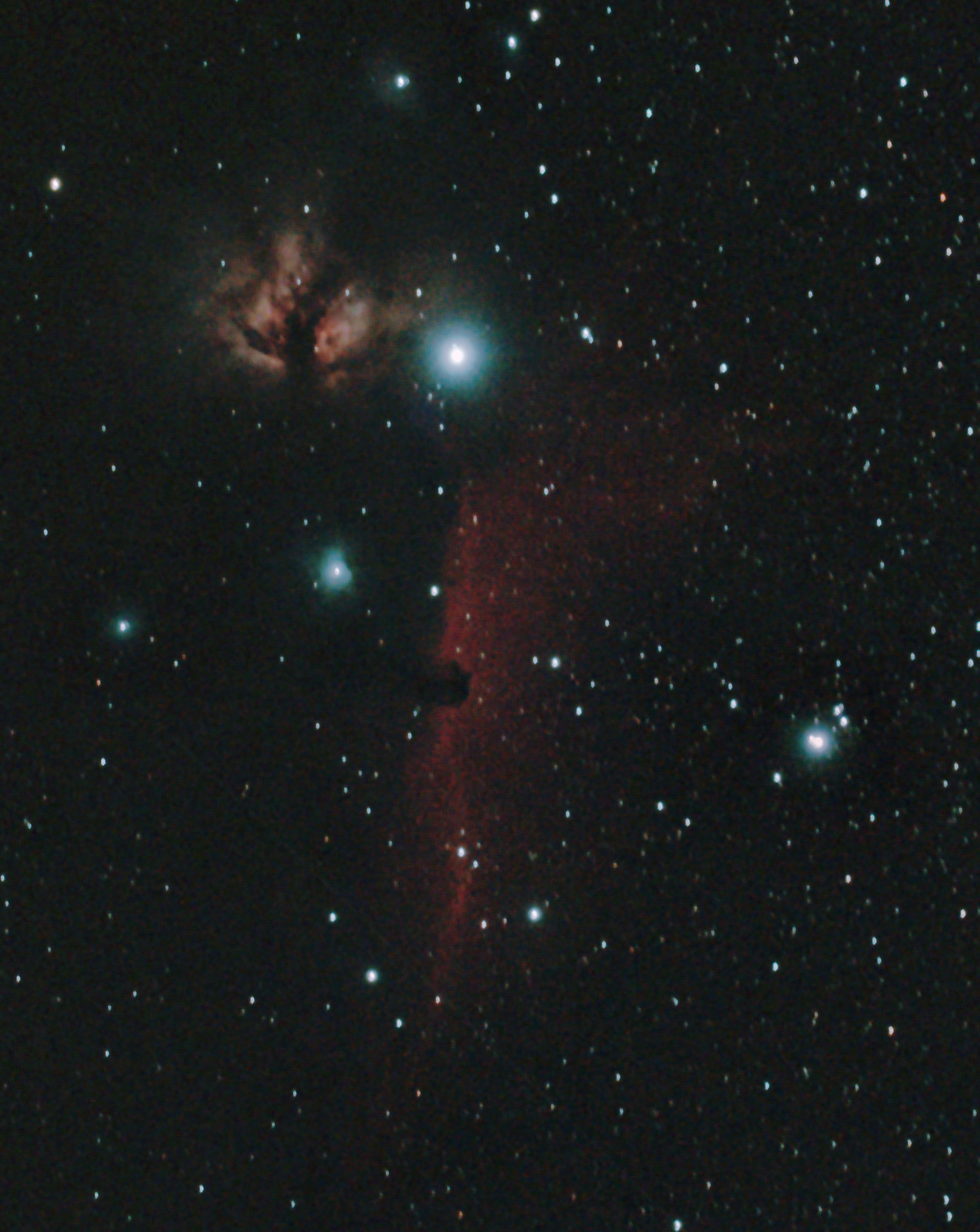 The Horsehead and Flame Nebulae. The Horse is located directly below (south) the large bright Alnitak triple star which forms the eastern (left) end of Orion’s belt, about half way down the image, sticking its ‘head’ into the red curtain of nebulosity. The Flame is just to the left (east) of Alnitak.