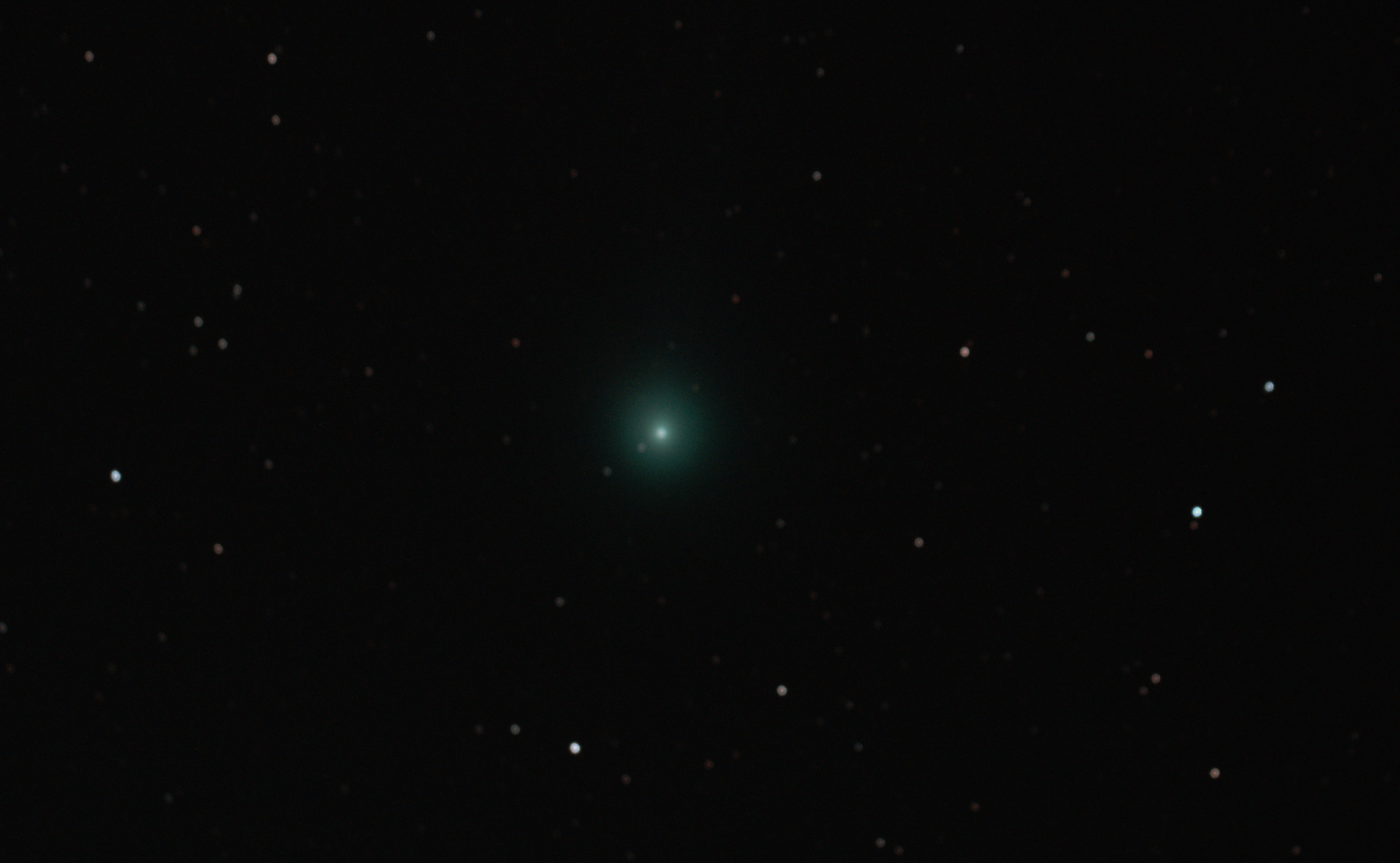 I had already posed this question on Stargazers Lounge and had a number of useful suggestions. Of course, whilst the mount tracks the celestial sphere, the comet is making its own way through the sky, which is not the same path as the stars seen from Earth; I believe it is possible to track the actual comet but that’s too difficult for me. Therefore, it is necessary to err towards lots of shorter exposures to avoid blurring; the longer the exposure the more likely it is the comet’s tail can also be captured in the image but it is a fine line between achieving this and blurring.  In the end I took two sets of images at 20 seconds and 60 seconds – probably too cautious but I was happy with the result and will be better prepared for my next comet, whenever that is.