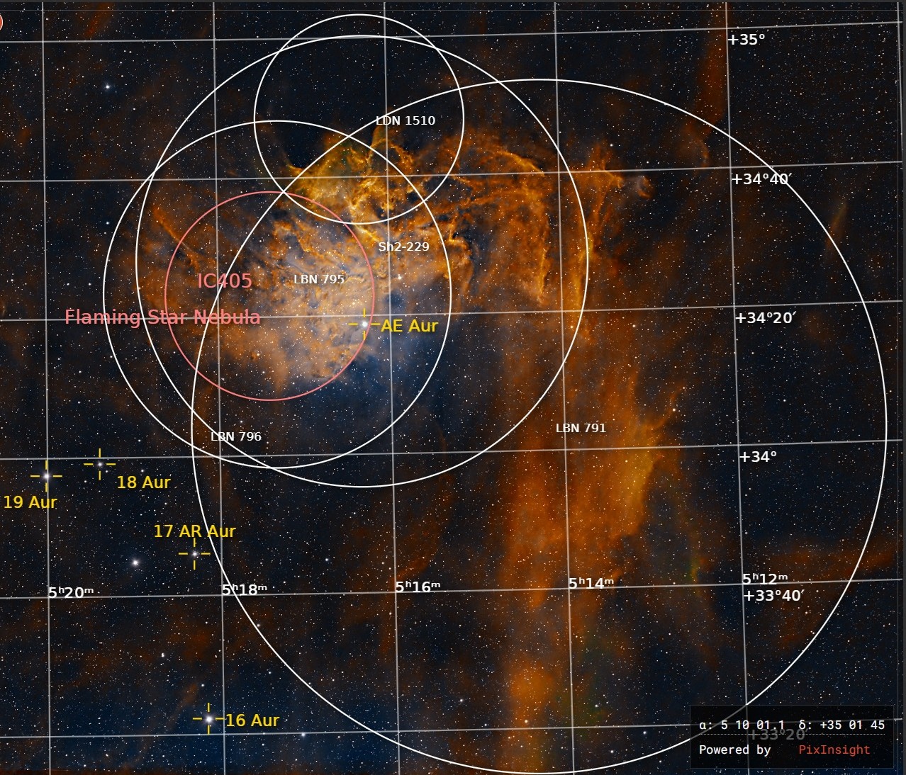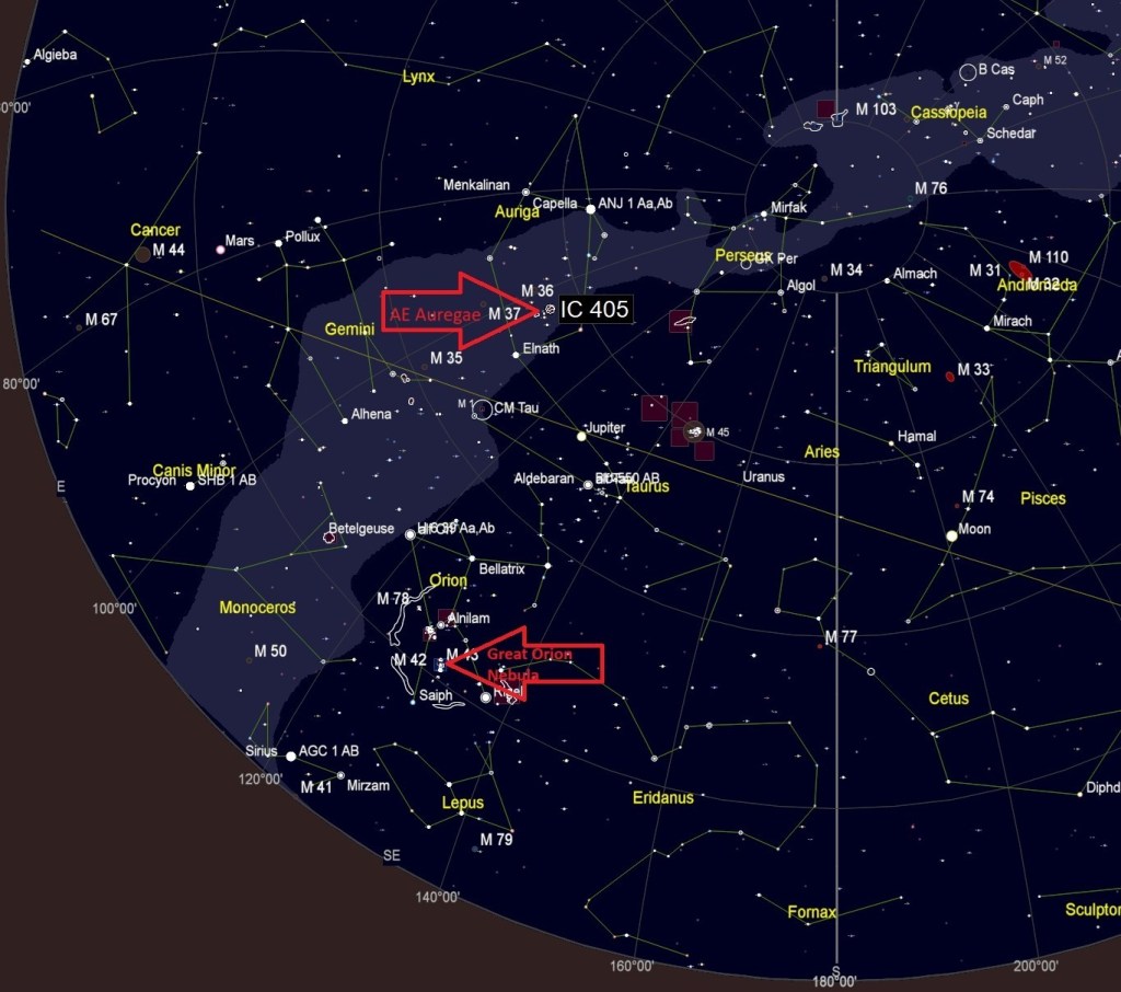 | FEBRUARY | FLAMING STAR NEBULA, IC405 (1) This nebula is illuminated by a powerfully bright blue variable star, AE Aurigae. The object’s epithet comes from the brightly lit ripples of gas and dust at the top of the image, illuminated by AE Aurigae and glowing hydrogen gas. This “runaway star” was ejected by a collision two million years ago from the Triangulum region of The Great Orion Nebula. | |