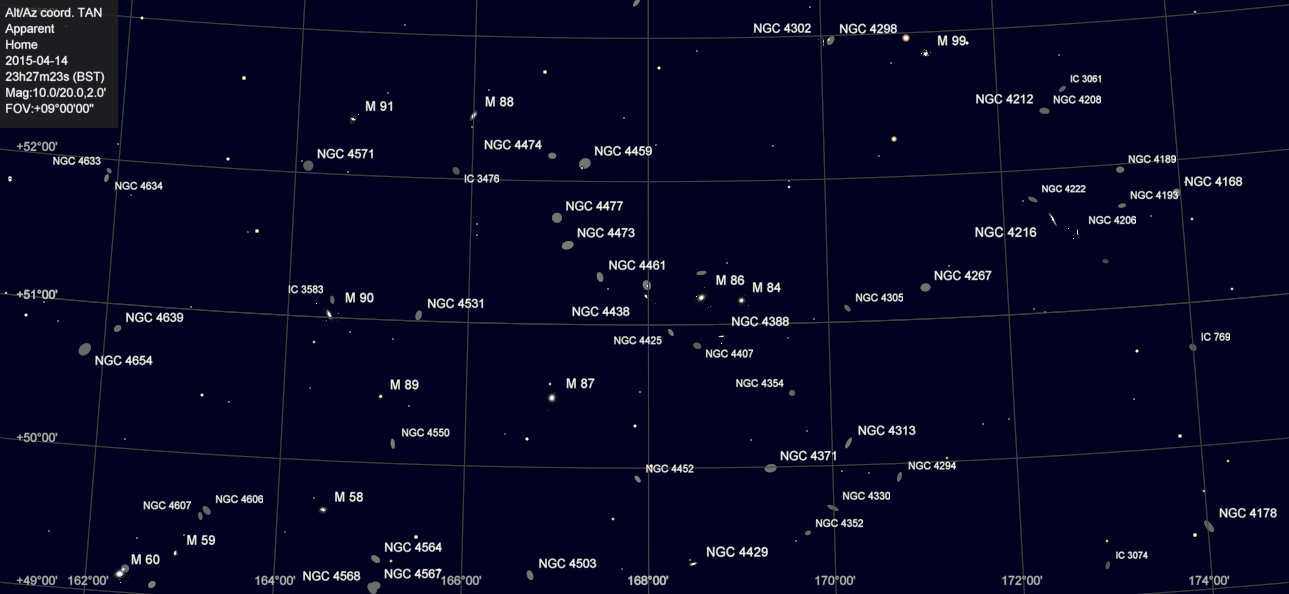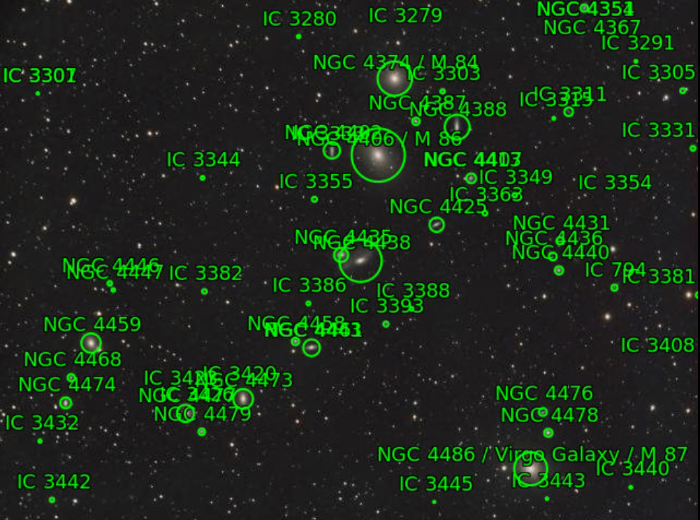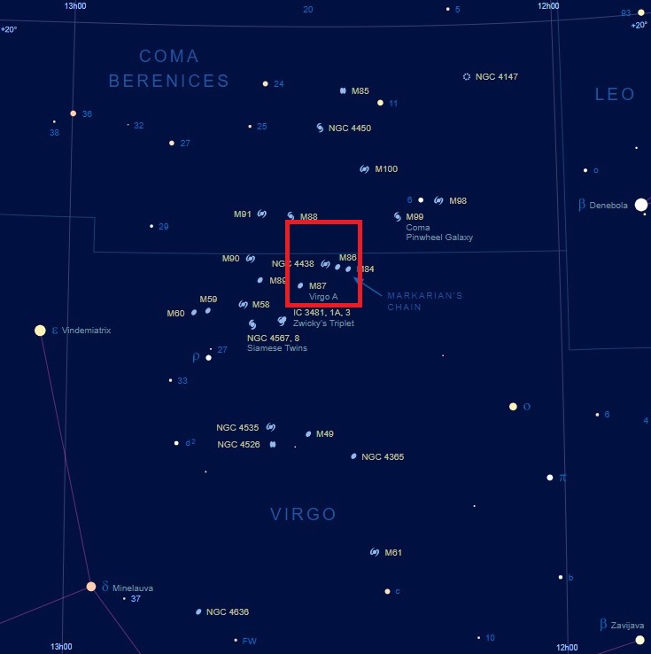 - As previously noted, there are many other galaxies in this part of the Virgo Cluster. Perhaps most notable though is M87, from which the first ever image of a black hole was the obtained in 2019 – consisting of some 6.5 billion solar masses.